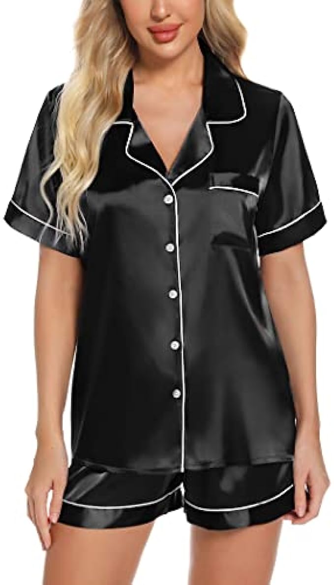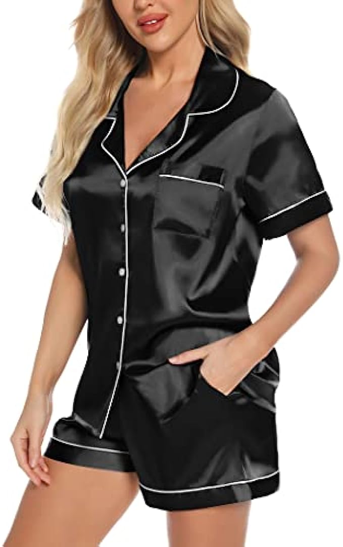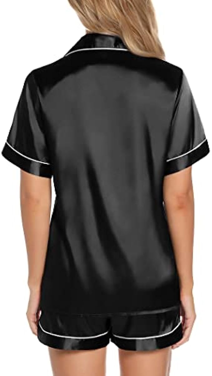 Anjue Silk Satin Pajamas Set Women's Short Sleeve Sleepwear Soft Pjs Shorts Set Two Piece Button Down Pj Set S-XXL