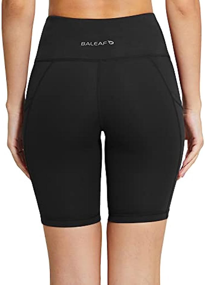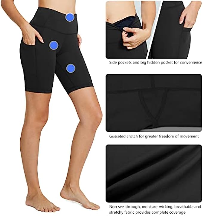 87% Polyester, 13% Spandex Imported Elastic closure Machine Wash Moisture-wicking, breathable and stretchy fabric provides moderate compression High-rise, wide waistband creates no muffin top and provides maximum coverage while bending and stretching Our women's compression biker shorts feature 2 big side pockets, deep enough for 4" to 5.5" mobile phones