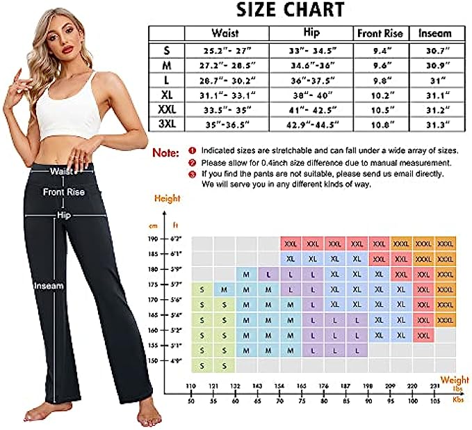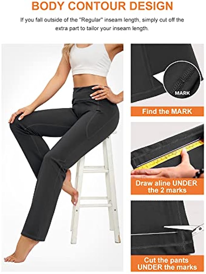 73% polyester 27% spandex ULTRA-SOFT MATERIAL: Bootcut workout pants(Upgrade) for women are made from materials with 73% Polyester & 27% Spandex premium butter. Super stretchy and soft, large proportion polyester retains its shape and is very durable, easily washed & dried. HIGH WAIST & TUMMY CONTROL: Yoga pants a High-Rise Waistband with Tummy Control design, it won't roll down even you do a wide range of movement, 4-way Stretch material that promotes both compression and support. Sweat-wicking, Non-See-Through and make streamlined look. Perfect womens dress pants. FUNCTIONAL THREE POCKETS: The bootleg pants with 2 side pockets & 1 waistband pockets are ideal for keeping your cards, keys, etc. while you're on the yoga or working out at any places. 2 side deep pockets can fit a large smart phone can let you move, squat or do any poses in your exercises. UNIQUE DESIGN: Design your own work pants that suit you best, whether you’re tall or petite, slim or plus-size or anyother. You can alter these yoga pants to your preferred inseam length all on your own; find two symmetrical marks at the bottom of the flare pants and trim. Don't worry, they won't lose their bootcut shape in the process. VERSATILE SCENES: If you're looking for even more cozy pieces for your closet, workout pants would be your Best Choice either for work, casual or daily wear, yoga pants for women can be matched from high heels to flat shoes, from office to yoga classroom, so that both your work, life and exercise can be connected seamlessly.