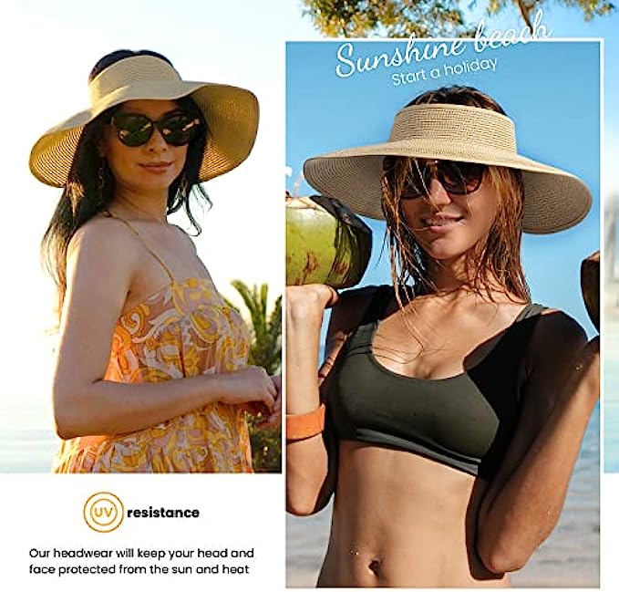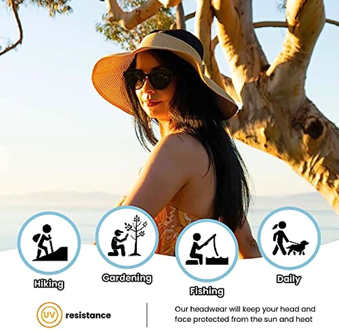 100% Straw Imported Hook and Loop closure Comfortable Sun Hat: This women sun hat with wide brim is made of high quality paper straw, light weight, breathable and comfortable, functional and stylish straw sun hat for women Wide Brim Sun Protection Hat: Fashionable and trendy designed straw hat, this beach sun hat for women has a wide brim for blocking out the sunlight, gives you great sun protection all over the face and neck, helps you cool in the sun Adjustable Summer Hat: Adjustable head circumference about 22"-23.2" to fit your head size; It is also suitable to wear even with various hair styles. With this topless ponytail straw sun visor, it is easy to throw your hair in a messy bun or ponytail, no more muss of your hairdo Packable Hats for Women: This packable straw sun hat features a roll up function, incredibly convenient as it is foldable for easy storage or for taking on the go while traveling, easy to keep it in your bag or suitcase, still keep its shape when any time you take it out Functional Beach Hats for Women: This beach hat is features with wicking sweatband to keep you super comfortable, and this straw hat is perfect for beach, pool, park, outdoor shopping, fishing, gardening or any other outdoor sports and activities