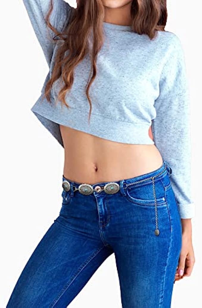 Western Belts for Women, Flower Turquoise Concho Adjustable Chain Belts, Western Jewelry Bling Rhinestone Belt with Buckle for Women Dresses Jeans Pants