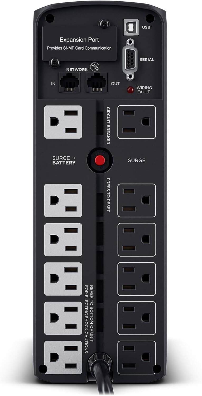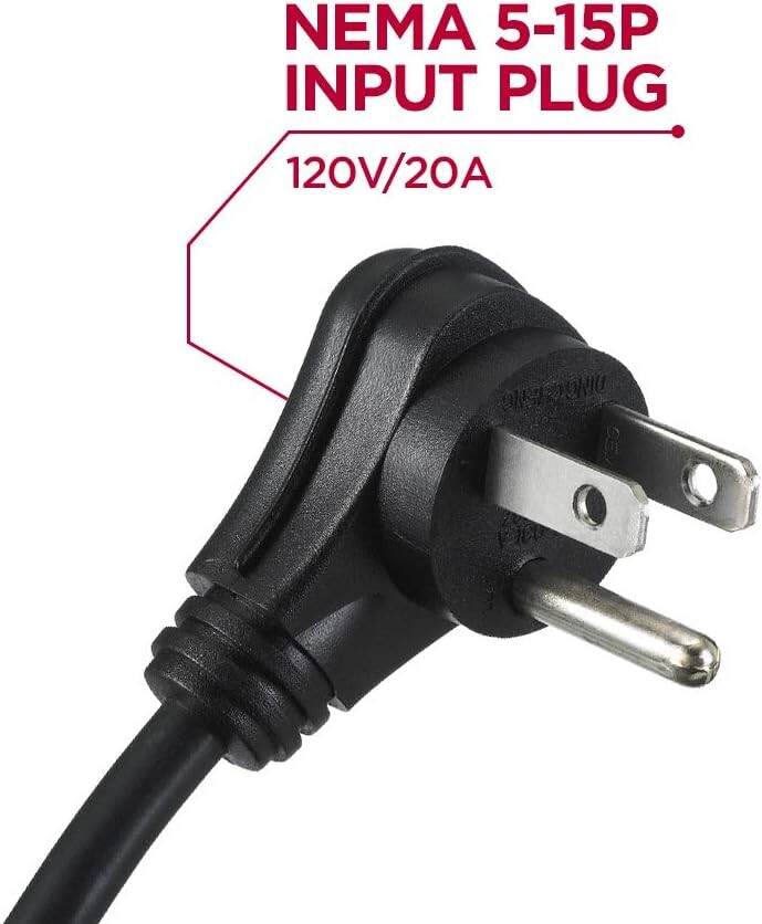 12 NEMA 5-15R OUTLETS: Six battery backup & surge protected outlets, six surge protected outlets; INPUT: NEMA 5-15P right angle, 45 degree offset plug with five foot power cord; 2 USB charge ports (1 Type-A, 1 Type-C) quickly charges mobile phones and tablets