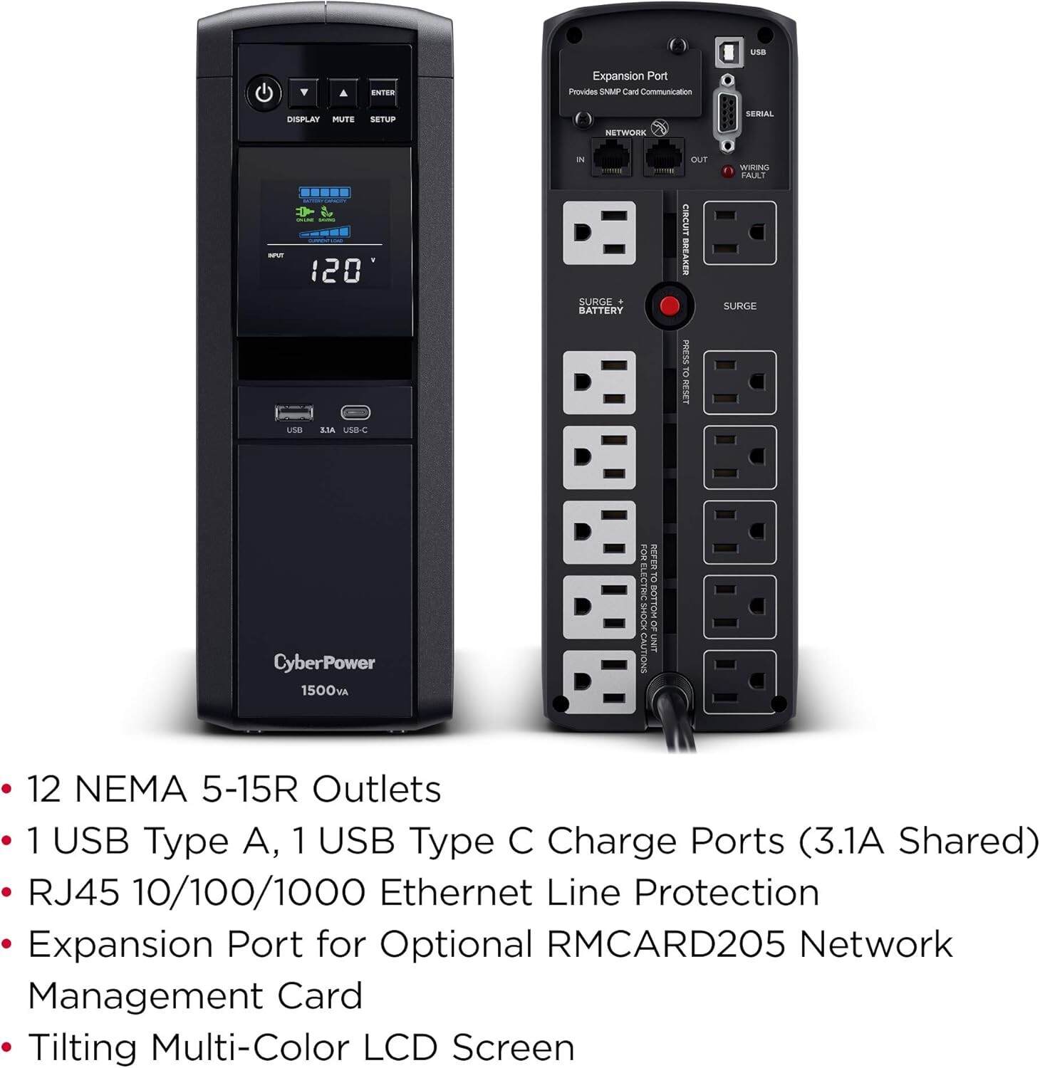 1500VA/1000W PFC Sine Wave Battery Backup Uninterruptible Power Supply (UPS) System designed to support active PFC and conventional power supplies; Safeguards computers, workstations, network devices, and telecom equipment