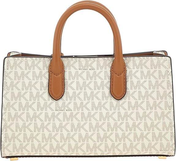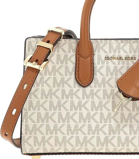 Materials: Crafted from our iconic Signature logo-print canvas with leather trim and gold-tone hardware Attention to Details: Interior back slip and zip pockets, snap fastening and poly-linen lining. 8.5”W X 5.5"H X 3"D with 3" handle drop and 22.5" optional/adjustable crossbody strap