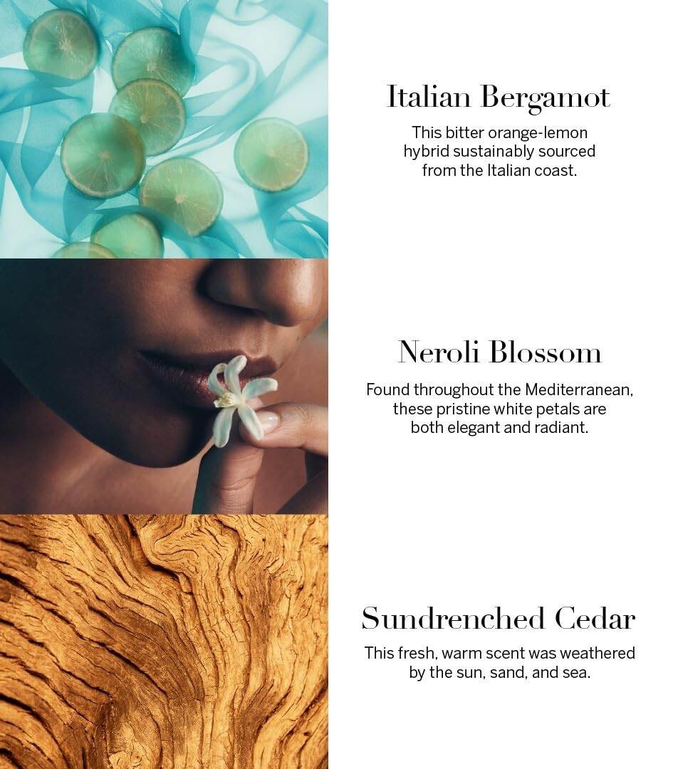 Scent notes of italian bergamot, neroli blossom, and sundrenched cedar.
